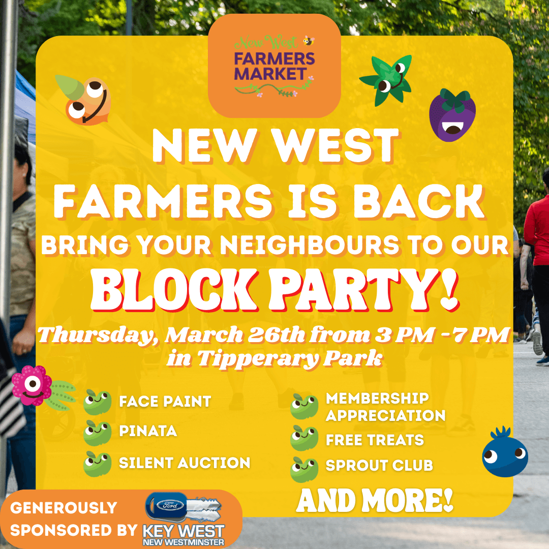We’re back! The New West Farmers Market’s 17th season kicks off on March 26th with a season kick-off Block Party!