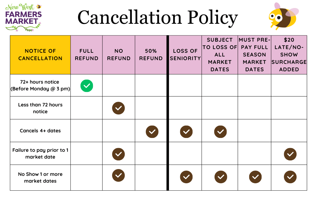 - Vendors who cancel more than 4 dates in the season will only be eligible to receive a 50% discount starting at the 5th cancelled market and will lose their seniority for the following year.